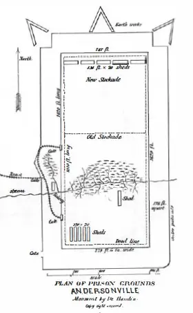 Lintern and other POWs were moved to the newly built Camp Sumter. Also known as Andersonville Prison, Camp Sumter is notorious for its high death count and awful living conditions. Lintern died just four months later in June of 1864. By then, the camp was overpopulated by 16000 prisoners, and had to be expanded, though it didn’t fix the problem. Overcrowding lead to strained resources and even structural problems. The main source of water for the prisoners was a stream that ran through the center of the camp. The banks eroded away only a few months in, forming a swamp which was the prefect breeding ground for disease-causing bacteria. (Pictured Right: Plan of Prison Grounds, 1865, courtesy of NPS/Andersonville National Historic Site)
