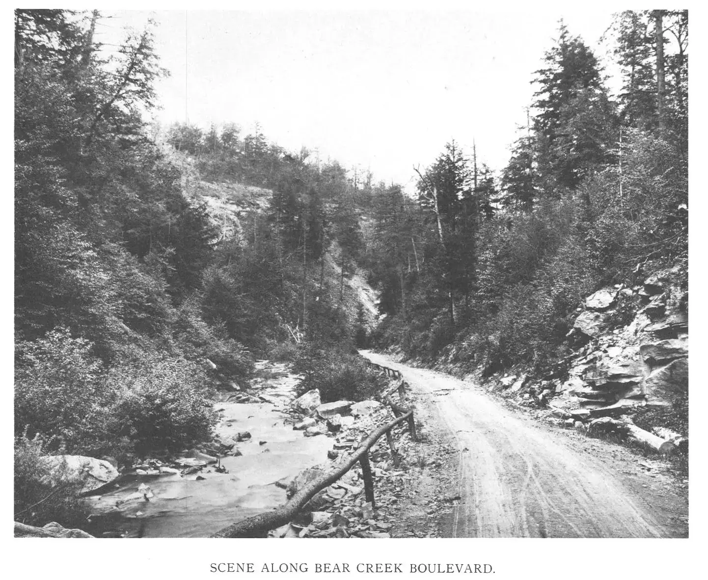 Late 1800s historical photograph reproduction from Wilkes-Barre Illustrated, 1891. Black and white image with descriptive text, matte finish heavy paper; sheet is 9.5" x 12.5", image alone is 7" x 9". Bear Creek Boulevard in the vicinity of Seven Tubs Nature Area off Rt. 115.