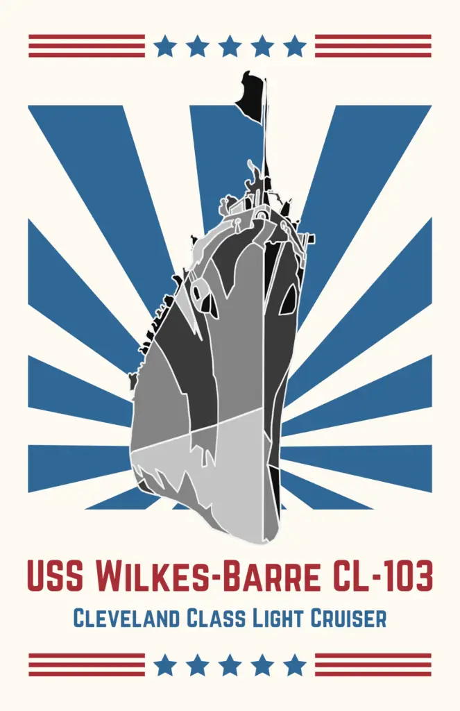 The Luzerne County Historical Society is pleased to offer these Commemorative USS Wilkes-Barre Posters for sale. The USS Wilkes-Barre, named after the city of Wilkes-Barre, was a Cleveland Class Light Cruiser that launched in 1943, participated in the Pacific Theater during World War II , and was the last Light Cruiser in the US inventory. The poster design is inspired by wartime posters during World War II, and shows the USS Wilkes-Barre at launch. Each poster is full color, measures 11”x 17” and is printed on heavy parchment cardstock, making it suitable for framing.