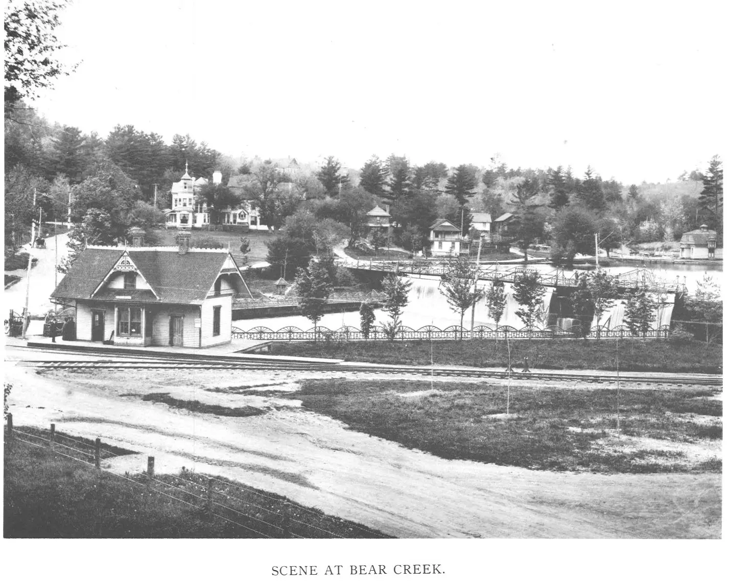 Late 1800s historical photograph reproduction from Wilkes-Barre Illustrated, 1891. Black and white image with descriptive text, matte finish heavy paper; sheet is 9.5" x 12.5", image alone is 7" x 9". Bear Creek Dam along Rt. 115, Bear Creek Village.
