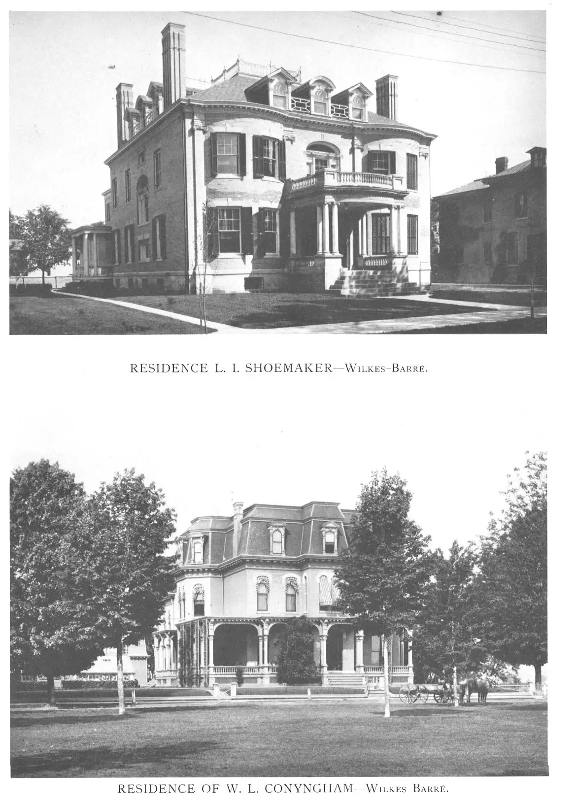 Late 1800s historical photograph reproduction from Wilkes-Barre Illustrated, 1891. Black and white image with descriptive text, matte finish heavy paper; sheet is 9.5" x 12.5", image alone is 7" x 9". A split image showing both the Shoemaker and Conyngham residences. The Shoemaker house is now the Westmoreland Club; the Conyngham house was torn down and is now the site of the Dorothy Dickson Darte Center.