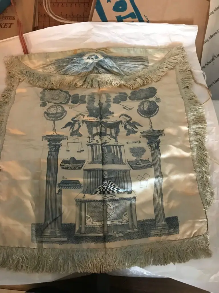 The fraternity’s aprons are inspired by the protective work aprons worn by actual stonemasons during the 1600s and 1700s. Masonic aprons were worn around the waist at meetings. Apron shape, color and design are determined by Masonic governing authorities, generally each state’s Grand Lodge, in the United States.