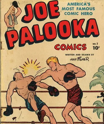 While there were earlier comics under the Joe Palooka name, they were merely compilations of newspaper strips. The issue shown here (above), published in 1945, was the first in a series of monthly original Palooka stories. In issue #1, a wounded Palooka entertains his fellow soldiers on a transport ship with the story of his accidental World Heavyweight Title win. Joe enlisted to serve his nation despite being champ, fought the Nazis and encouraged readers to buy war bonds and plant victory gardens.  Later on, Palooka hob-nobbed with many celebrities of his day, most famously golfing with Bob Hope (you can check out that strip at this link, just scroll down the page a bit: https://en.wikipedia.org/wiki/Joe_Palooka).